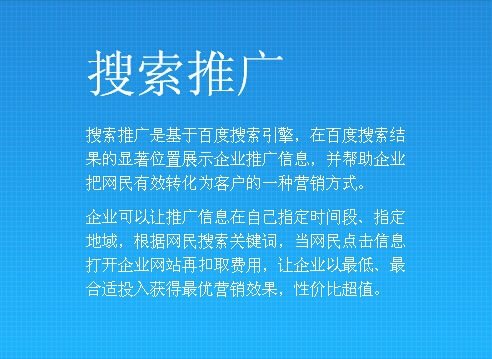 百度推广服务方式:最突出的特点在于按效果付费,只要有搜索用户对推广信息产生兴趣并主动点击了解详细信息才收取推广费用。让客户的推广费用投入到高意向潜在客户身上,针对性强,而且是客户主动找上门,行商变坐商,效果更好。