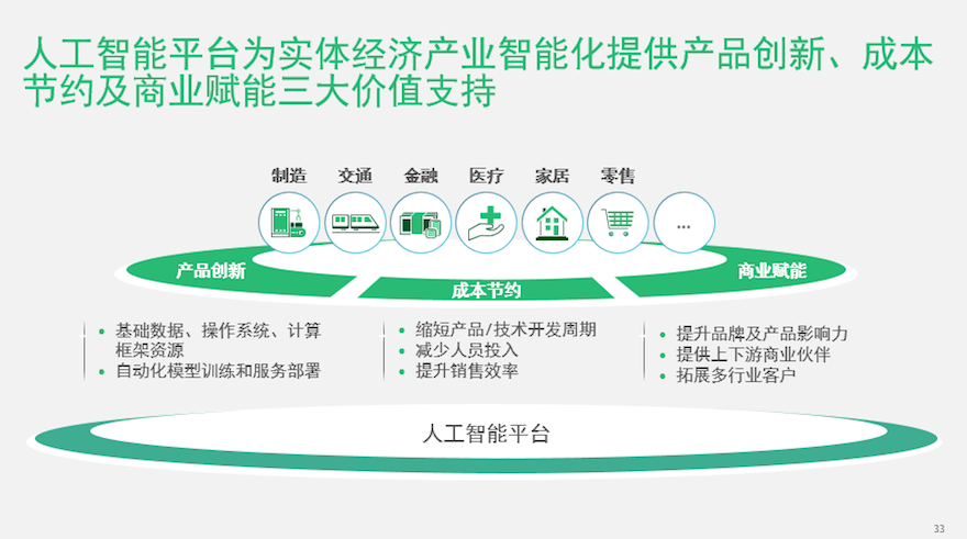 人工智能平台能够为实体经济产业智能化提供产品创新、成本节约及商业赋能三大价值支持。无论是无人驾驶领域还是语音交互领域,开放平台的出现确实都有效推动了行业发展。